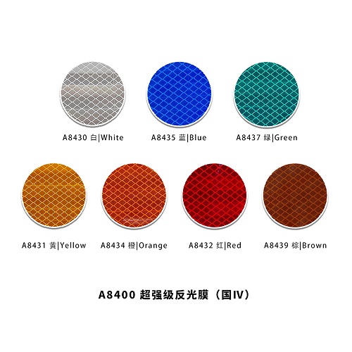 安元超強級8400反光膜具有高逆反射系數、高耐候性、粘貼平整不會起皺等特性;常用顏色逆反射系數:白色380、黃色300、紅色80、橙色165、藍色50、綠色80、棕色40。產品加工粘貼好后在戶外耐寒溫度在-10°左右,耐熱溫度在70°左右;但是在粘貼反光膜的時候溫度最好控制在10°-36°之間。