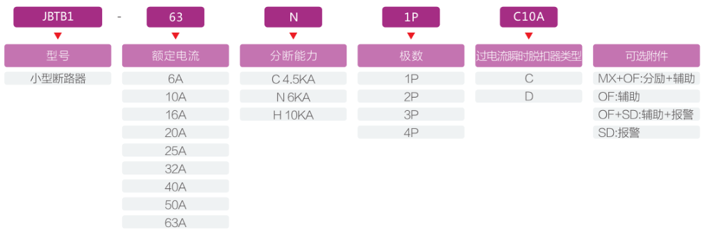 JBTB1-63系列小型斷路器,適用于照明配電系統(tǒng)(C型)或電動機(jī)的配電系統(tǒng)(D型)。