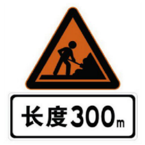 第二類(lèi)是作業(yè)區(qū)長(zhǎng)度標(biāo)志,此類(lèi)標(biāo)志告知駕駛?cè)藛T緩行路段長(zhǎng)度;標(biāo)志牌使用橙色反光膜做為底膜,圖案部分與邊框使用黑色反光膜制作,搭配一塊長(zhǎng)度距離的輔助標(biāo)志一起安裝。